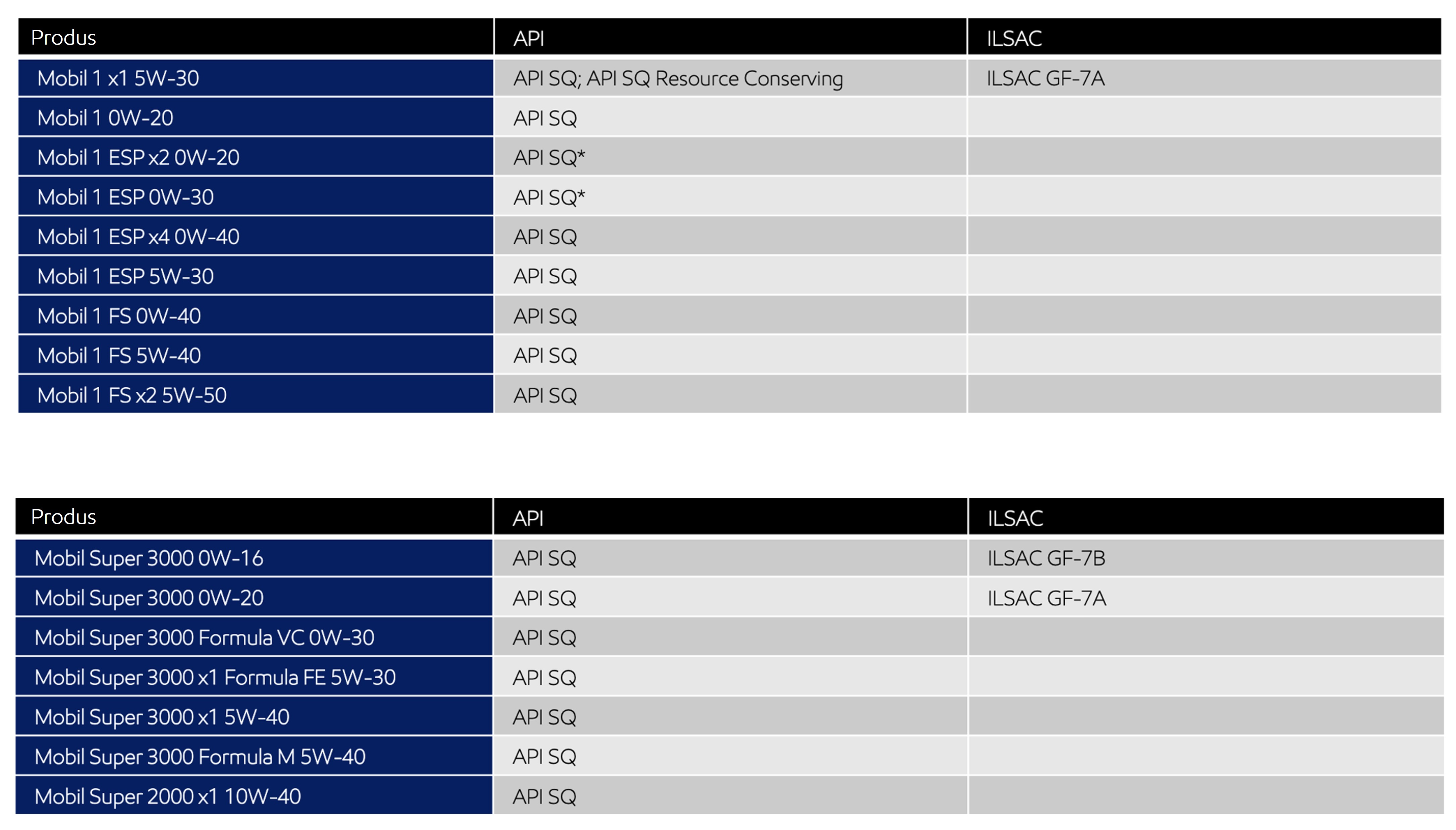 Gama actualizată include mai multe produse Mobil 1 și Mobil Super, acoperind o varietate largă de clase de vâscozitate utilizate în prezent. Lista de mai jos prezintă uleiurile care îndeplinesc sau depășesc cele mai recente cerințe API SQ și ILSAC GF-7, conform ultimelor actualizări.